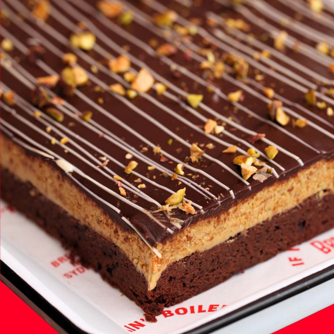 Fudgy Chocolate Brownie layered with Kataifi Pistachio Cream with Tahini notes, Dark Chocolate Ganache and crushed Pistachios.